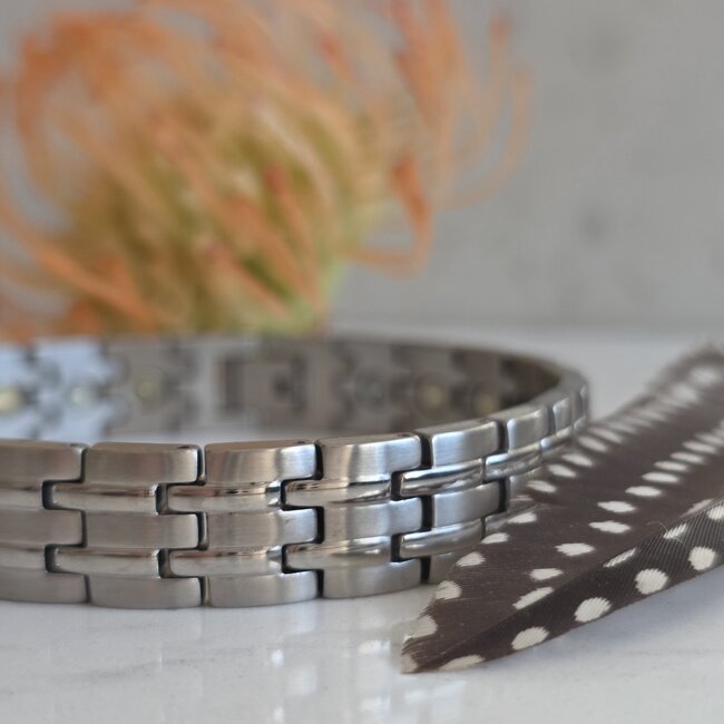 Deze zilverkleurige magneetarmband is uitgevoerd in duurzaam roestvrij staal met een mat-glanzende afwerking. Het elegante schakelontwerp geeft de armband een prachtige tijdloze uitstraling die moeiteloos combineert met zowel casual als zakelijke outfits.